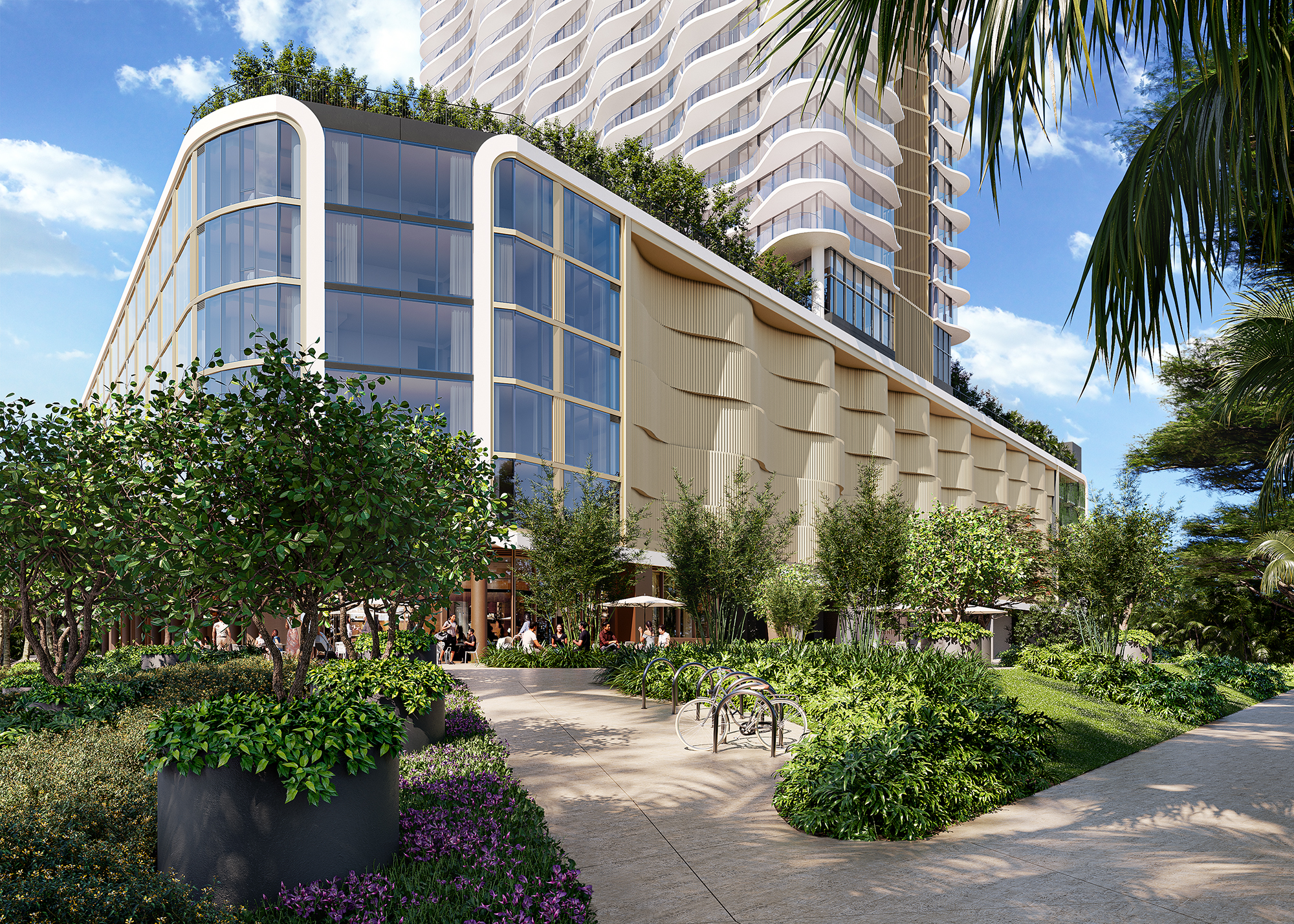 At street level, The Launiu Ward Village will feature retail, dining, and gathering spaces, complete with landscaped sidewalks, pedestrian, and bicycle paths that connect to Ka La‘i o Kukuluāe‘o Park and the adjacent Ulana Ward Village®, furthering Ward Village’s connected, walkable, and bikeable neighborhood. Shade from new trees, native plants, sculptural benches, and space for movable kiosks enhance the area for comfort and livability.